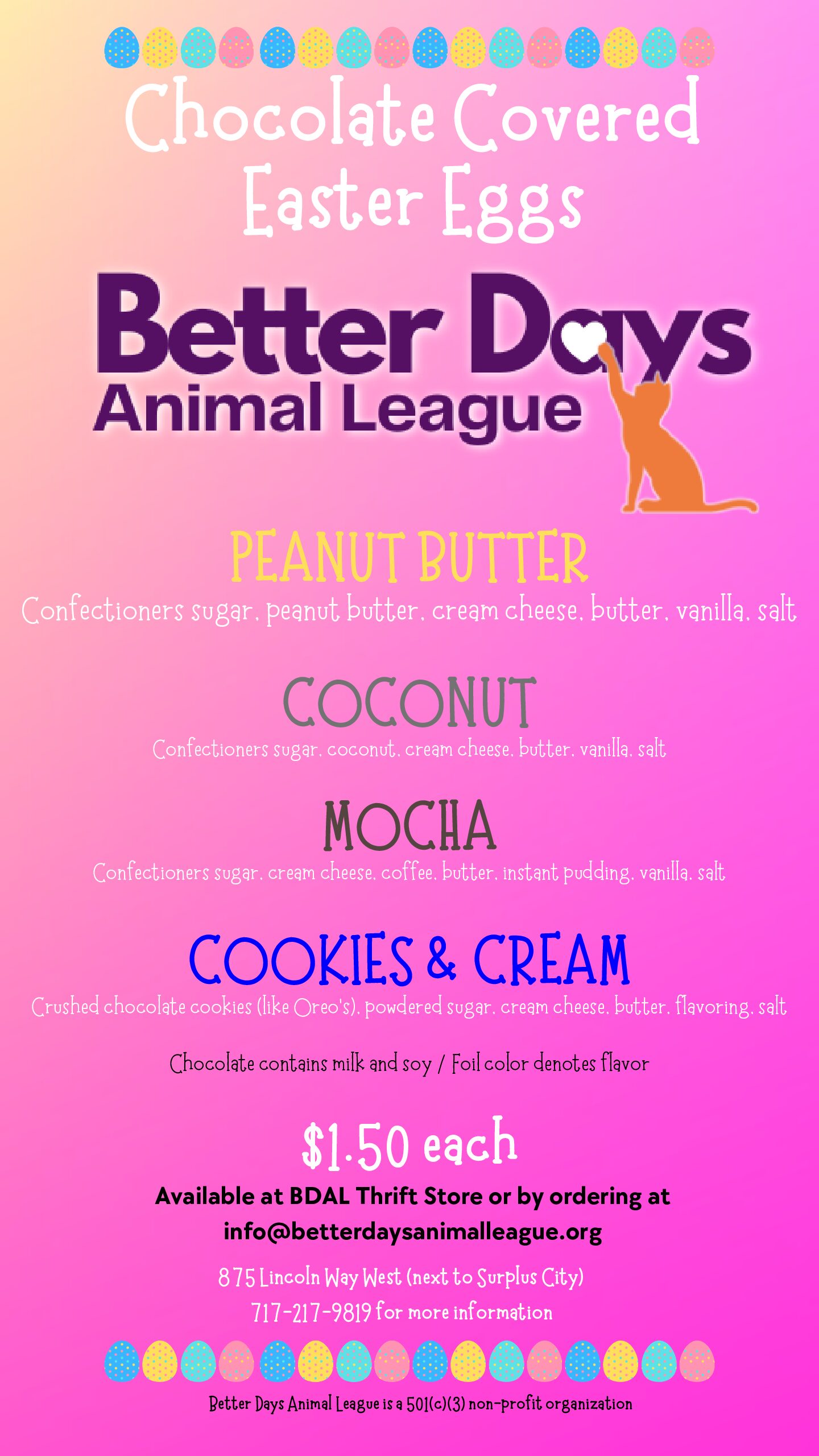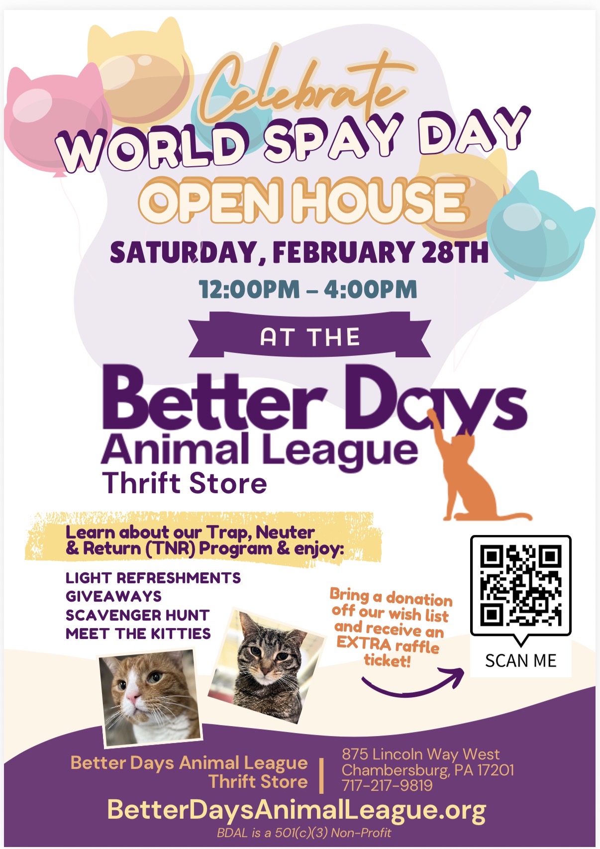 Better Days Thrift Store, at 875 Lincoln Way West, will be closed February 9th - February 17th for renovations Because of the renovations, the BDAL Thrift Store will not be able to accept donations from January 28th - March 3rd We apologize for any inconvenience this may cause